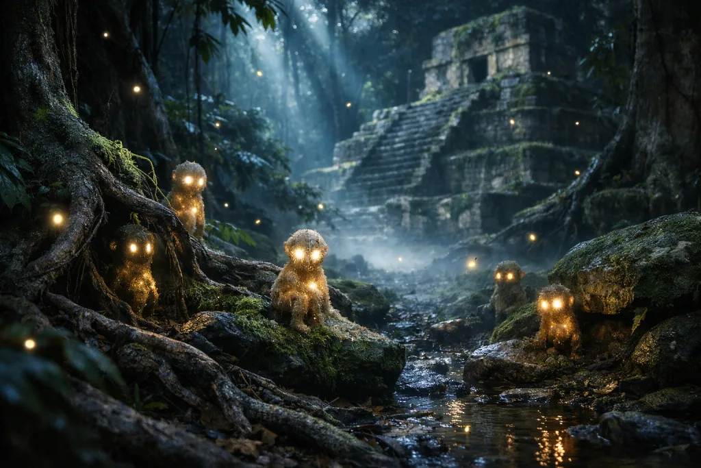 Los aluxes son pequeños seres míticos que habitan en la selva maya. Según la leyenda, estos duendes protegen la naturaleza y los tesoros ocultos, ayudando o engañando a los humanos según su comportamiento hacia la naturaleza.